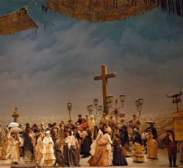 1. כי התפאורה של פרנקו זפירלי (Zeffirelli) מרהיבה. זו תפאורה אולטרה-ריאליסטית, שהוכנה במקור עבור ה"מטרופולין אופרה" בניו-יורק. יש בה עיצוב במה צבעוני ועשיר, תלבושות תקופתיות יפהפיות, תחלופה משמעותית של תפאורות בין המערכות, ובימוי שהושקעו בו הרבה מחשבה וכסף. בנקודות מפתח יש אפילו סוסים, שבמערכה הראשונה היו קצת ריאליסטיים מדי וחירבנו על הבמה לקול צהלות הקהל.