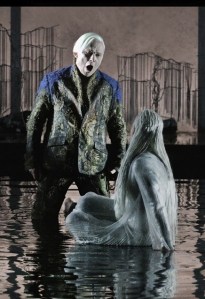 המערכה הראשונה מתרחשת באגם, שכאן הפך למעין בריכה מרובעת שהזמרים שרים מתוכה או מצידה. זה אומר שבקטעים מסוימים בקושי אפשר לראות אותם, וגם מבחינה אקוסטית מעמיד בפניהם אתגר גדול (מה שמעלה עוד יותר את ההערכה לזמרים ולבלאנס שיצר אטינגר). בנוסף לזמרים יש באגם קבוצת רקדנים, שאמורים לדמות את בנות ובני המים. הרקדנים מתפלשים במים או שוכבים בהם בלבוש אפור צמוד, והדימוי הראשון שקפץ לי לראש היה של עופות קפואים שהוצאו להפשרה. מקווה שלא יקומו מחר עם דלקת ריאות. עוד בולטות בתפאורה לאורך האופרה כפות ידיים ענקיות, שבחלק מהזמן תלויות מהתקרה ובחלק אחר מוצבות על הבמה. לא יודע מה תפקידן ולא דחוף לי לברר.